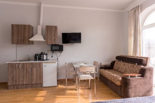 мини-кухня с микроволновкой , чайником , мультиваркой , холодильником и всей необходимой посудой ,сплит-системы , сейф , шкаф для одежды , телевизор , стол и стулья на балконе и в номере.
